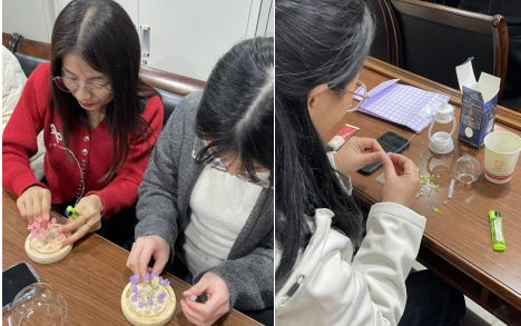 小夜灯 DIY 环节正式开始,女神们纷纷化身为创意大师。首先,大家拿起灯带串起郁金香花朵,用手捏出郁金香团簇的形状,接着,在郁金香绿叶涂抹热熔胶,小心翼翼地将绿叶和小装饰粘贴上去,瞬间,一个精致的郁金香花从立体起来。